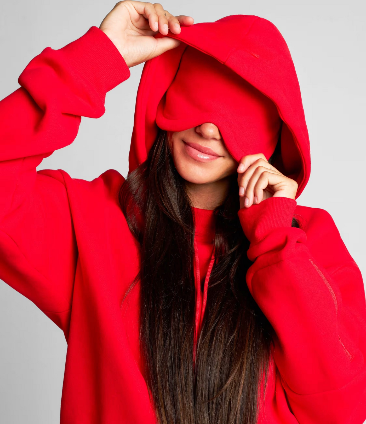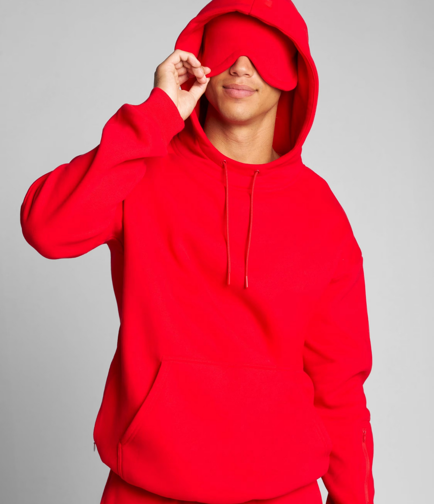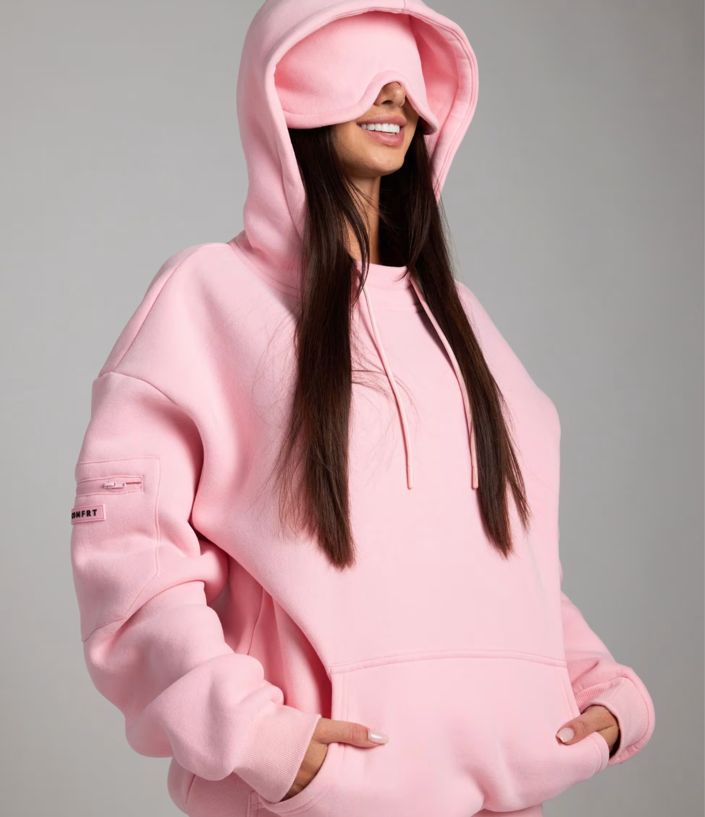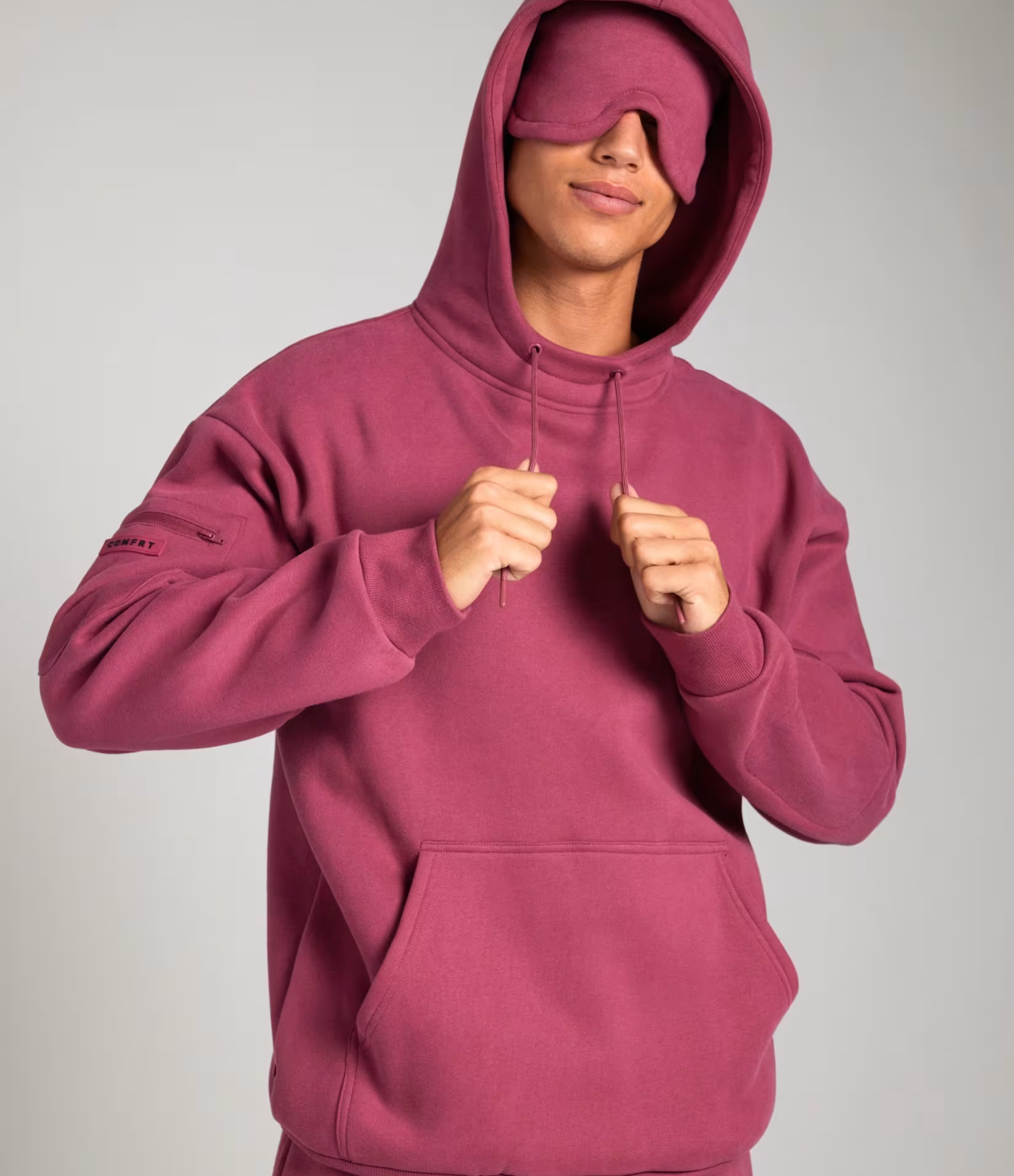 Den innebygde konturerte sovemasken blokkerer lys effektivt, slik at du kan hvile hvor som helst – på fly, tog eller hjemme. Den er laget for å gi komfort uten å trykke på ansiktet, og fungerer sømløst med hettegenserens overdimensjonerte hette.