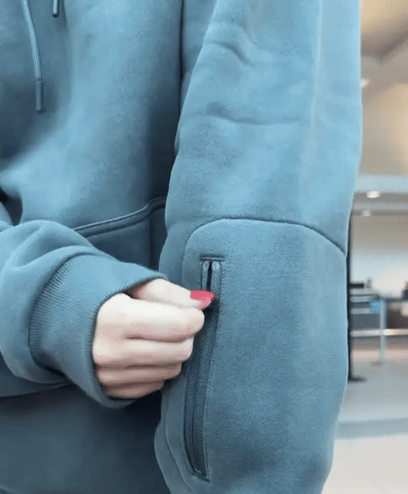 Reis trygt med smarte, skjulte lommer inne i kengurulommen. Disse sikkerhetslommene holder pass, ID, kontanter og andre verdisaker trygt og diskret, slik at du kan bevege deg gjennom flyplasser eller folkemengder uten bekymring. Alt holder seg beskyttet, men lett tilgjengelig, og gjør denne hettegenseren til din perfekte følgesvenn for organisert og stressfri reise.
