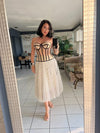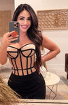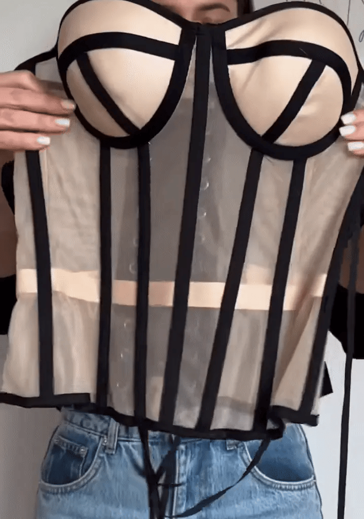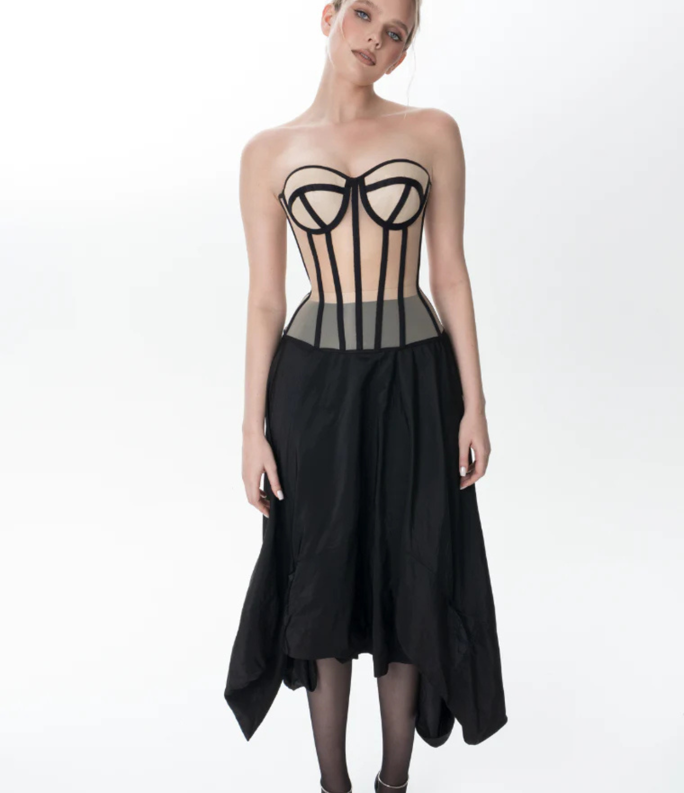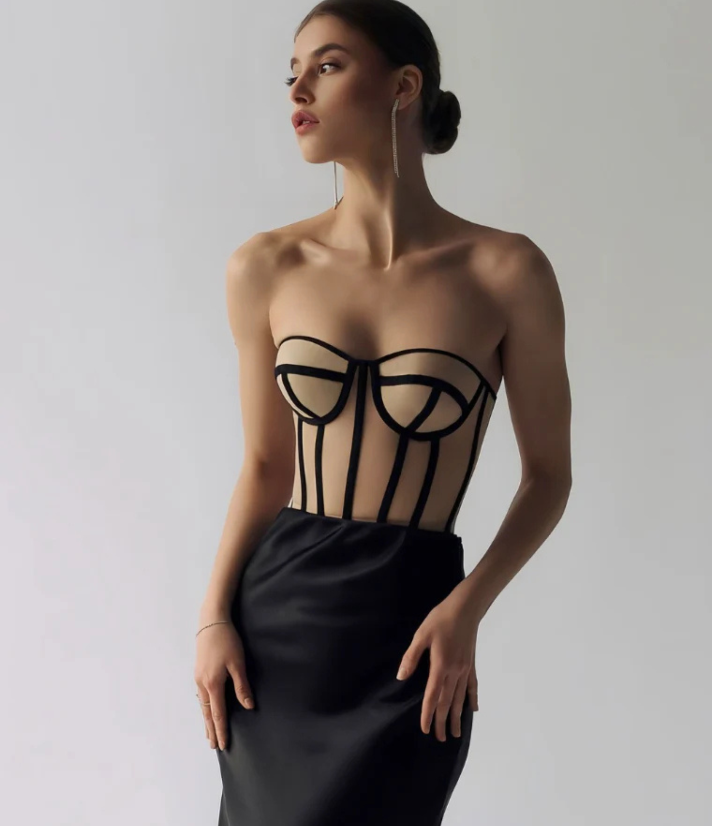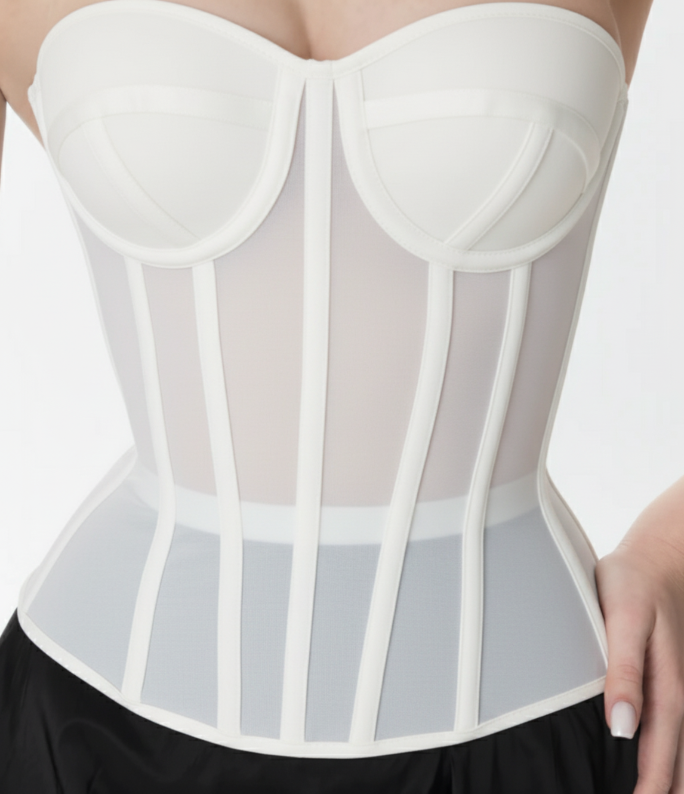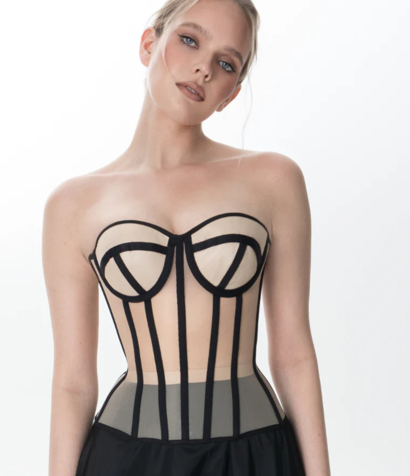 En forførende kombinasjon av transparent mesh og skulpterende svarte konturlinjer som fremhever hver eneste kurve. Den innebygde push-upen og det støttende rammestellet gir løft og form, samtidig som uttrykket er både elegant og dristig. Med snørelukking bak kan plagget justeres perfekt for festnetter, nyttårsfeiring og romantiske kvelder.