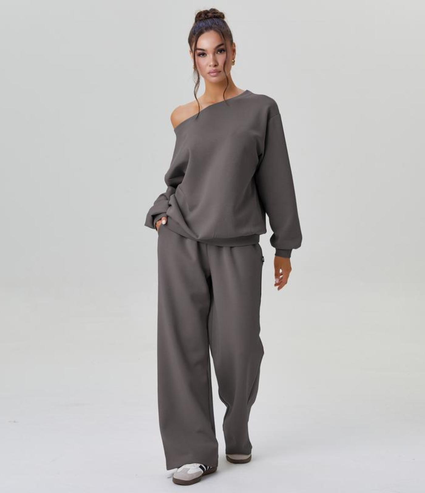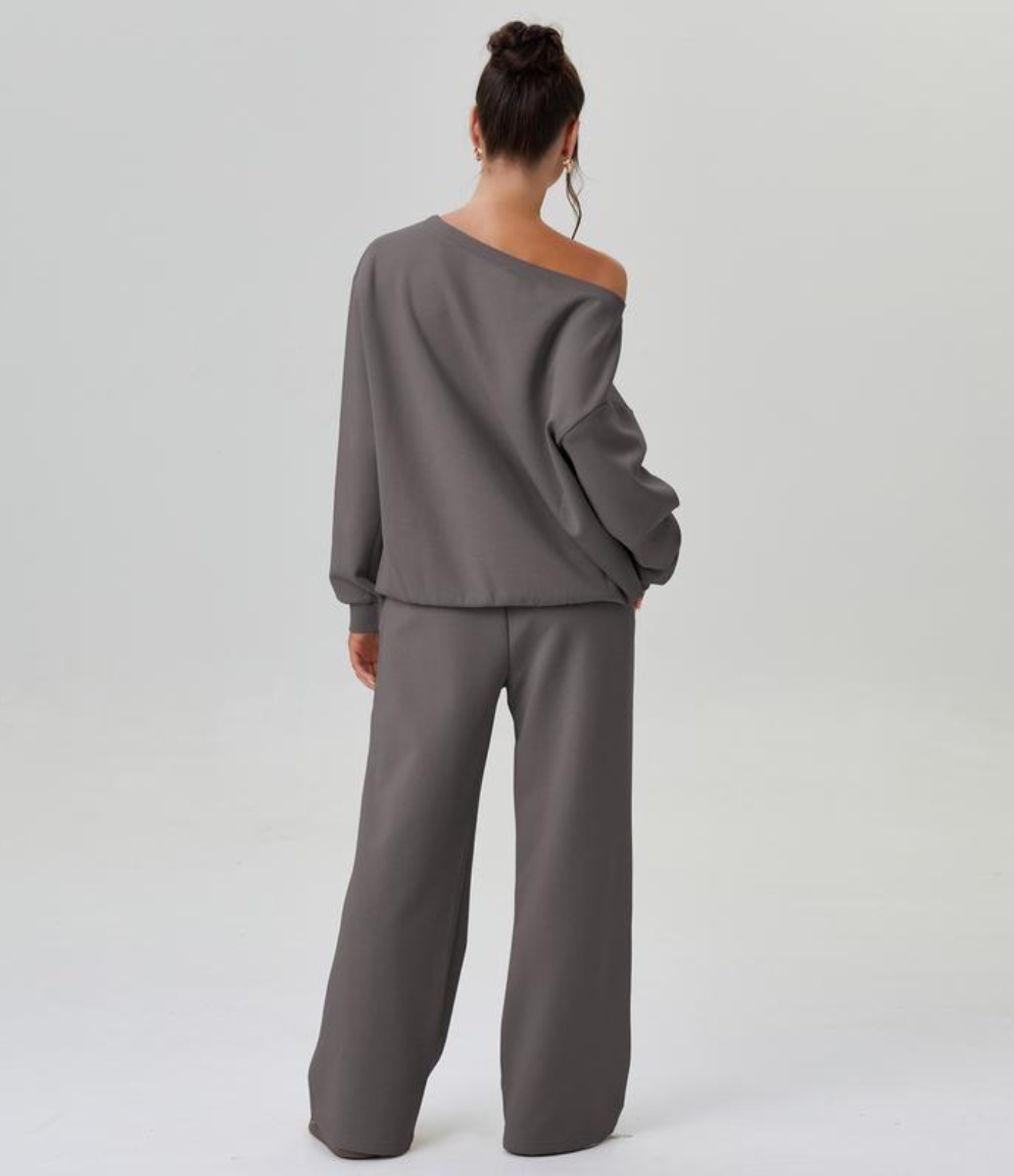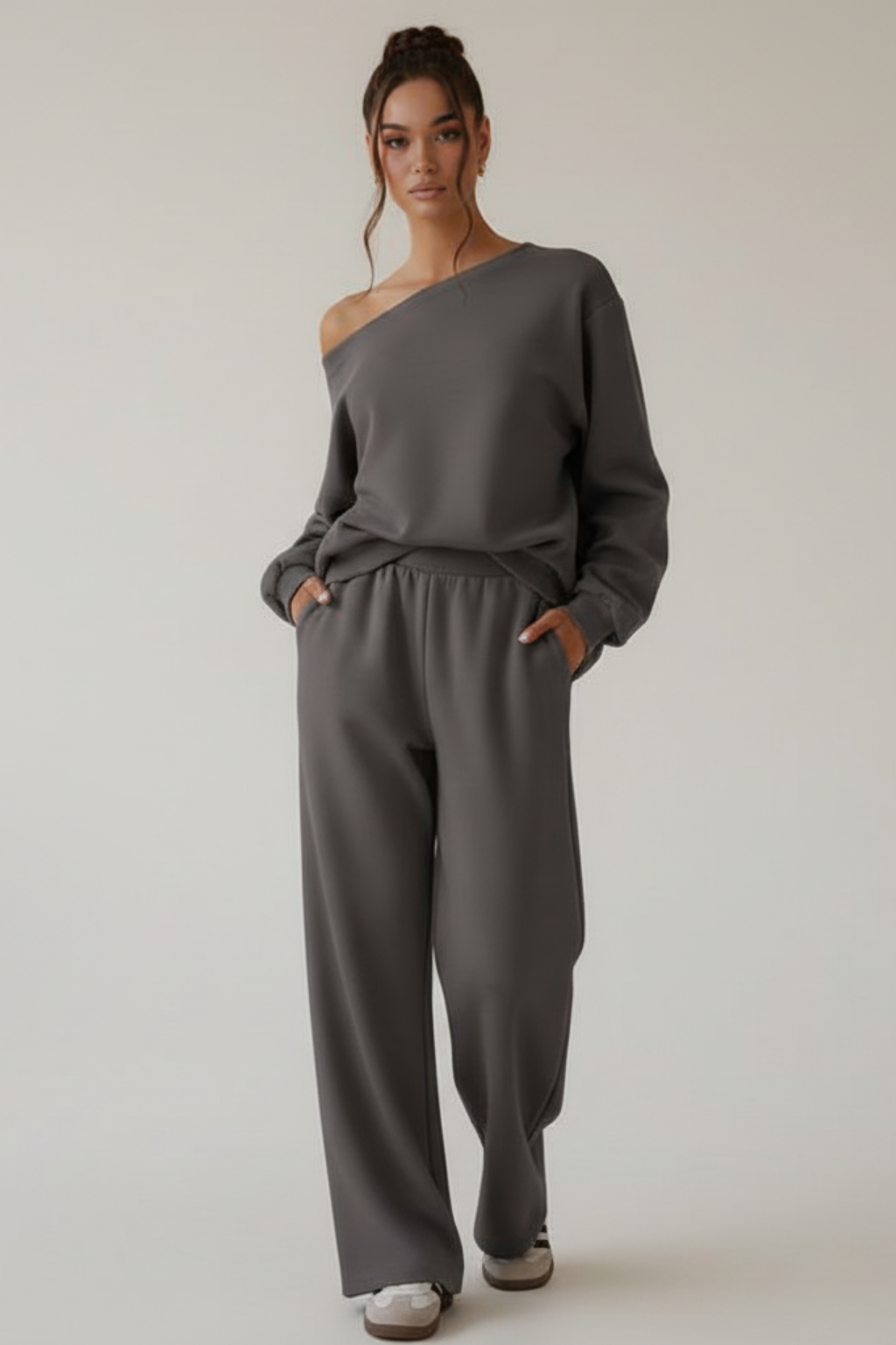 Trå inn i komfort hele dagen uten å gå på kompromiss med stilen. Dette løstsittende settet har en topp med skrånende skulder og scoop-hals, kombinert med vide bukser med høy midje og praktiske sidelommer. Mykt, elastisk stoff sørger for at du føler deg koselig hjemme, på jobb eller ute på fritid.
