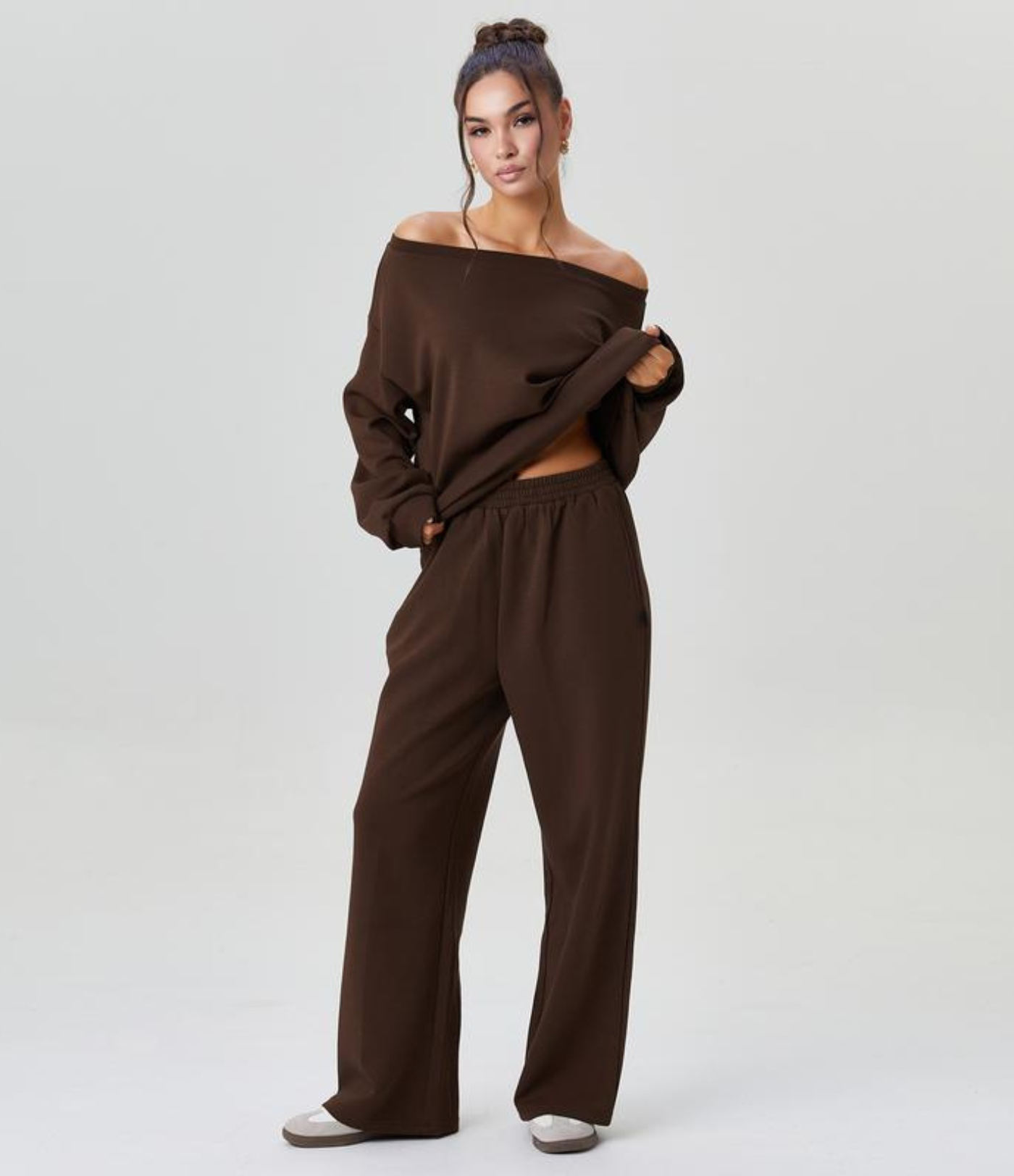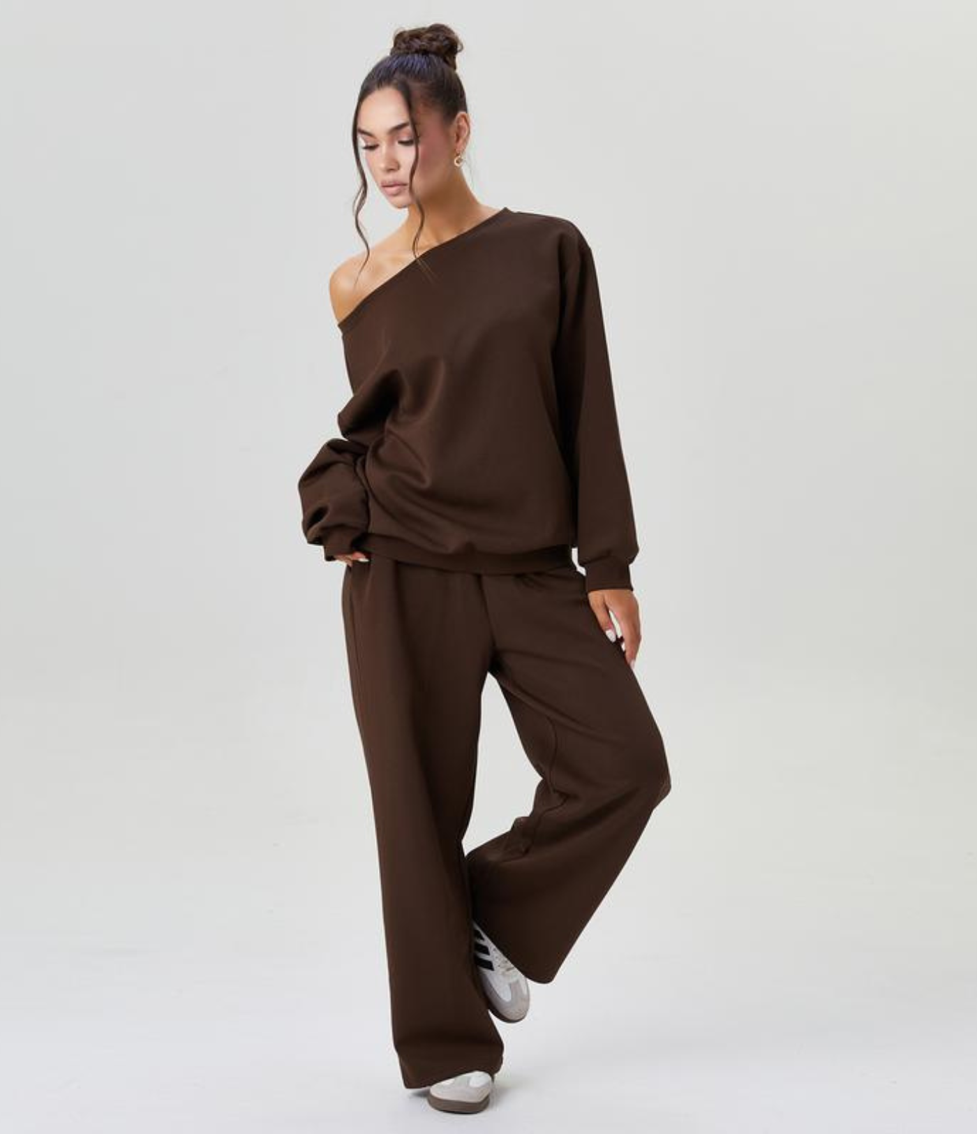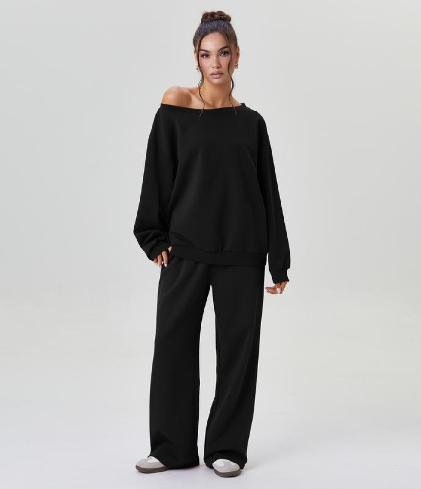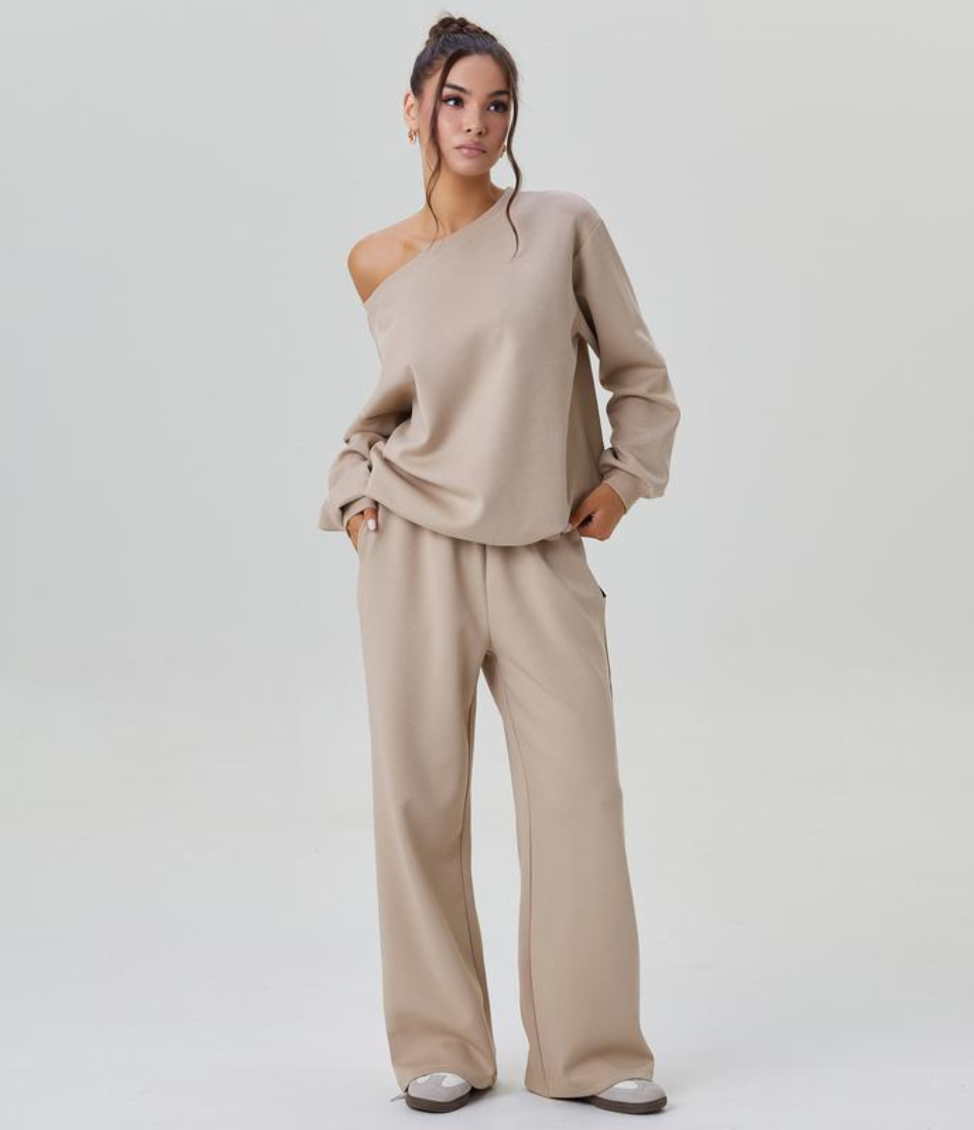 Trå inn i komfort hele dagen uten å gå på kompromiss med stilen. Dette løstsittende settet har en topp med skrånende skulder og scoop-hals, kombinert med vide bukser med høy midje og praktiske sidelommer. Mykt, elastisk stoff sørger for at du føler deg koselig hjemme, på jobb eller ute på fritid.