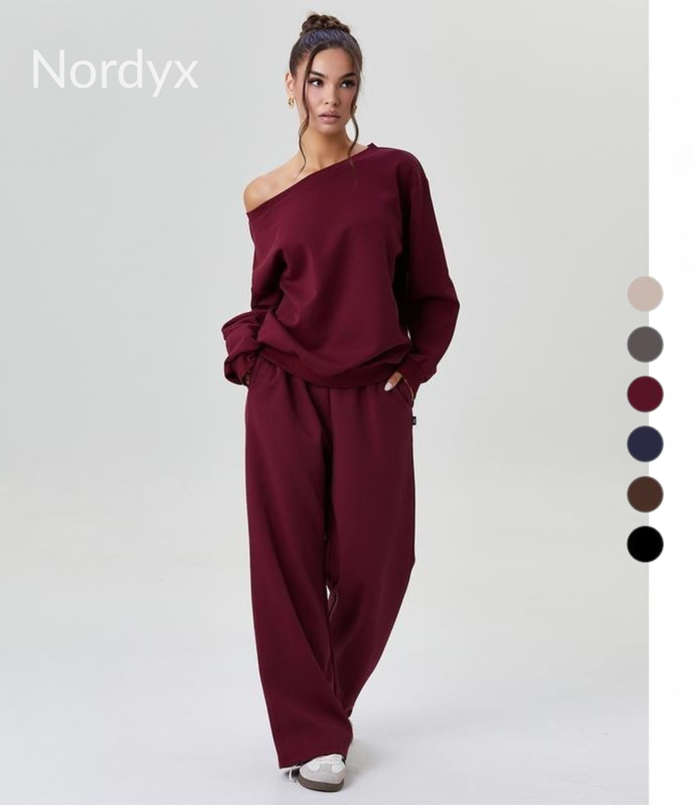 Føl deg stilfull og komfortabel med dette koselige Nordyx settet. Den myke, elastiske toppen og vide buksene gir full bevegelsesfrihet, mens den nøytrale, ensfargede tonen gjør det allsidig. Perfekt for avslapning, pendling eller uformelle utflukter.