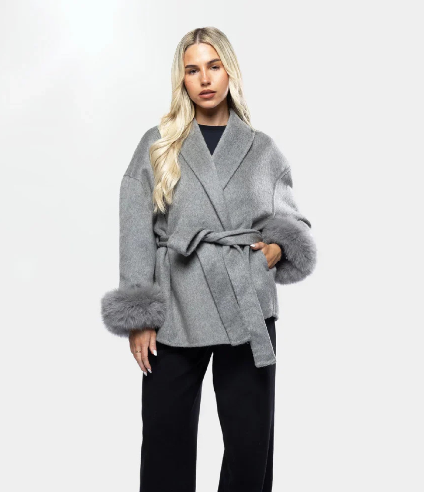 Denne kåpen har en figursydd wrap-design med belte i midjen, som lar deg justere passformen for en flatterende og tilpasset silhuett.