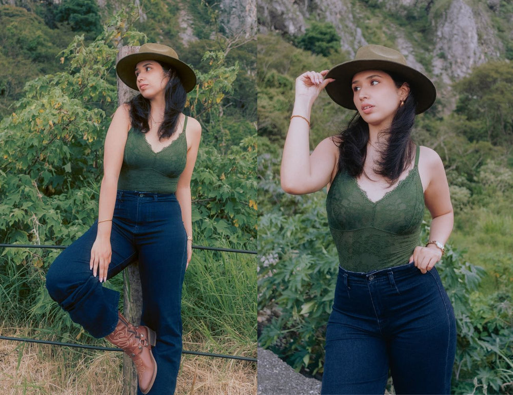 Å kombinere vår Nordyx blondebody med jeans skaper et chic og balansert uttrykk. Den avslappede, robuste teksturen til denim står i kontrast til den delikate blonden, og gir en moderne, men likevel enkel stil. Denne kombinasjonen er perfekt for hverdagsbruk, og blander femininitet med en avslappet touch.