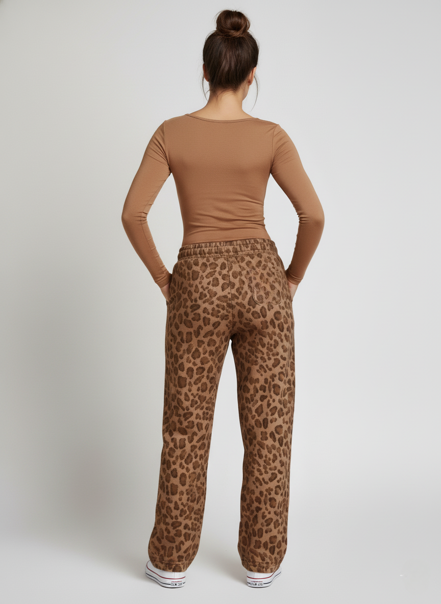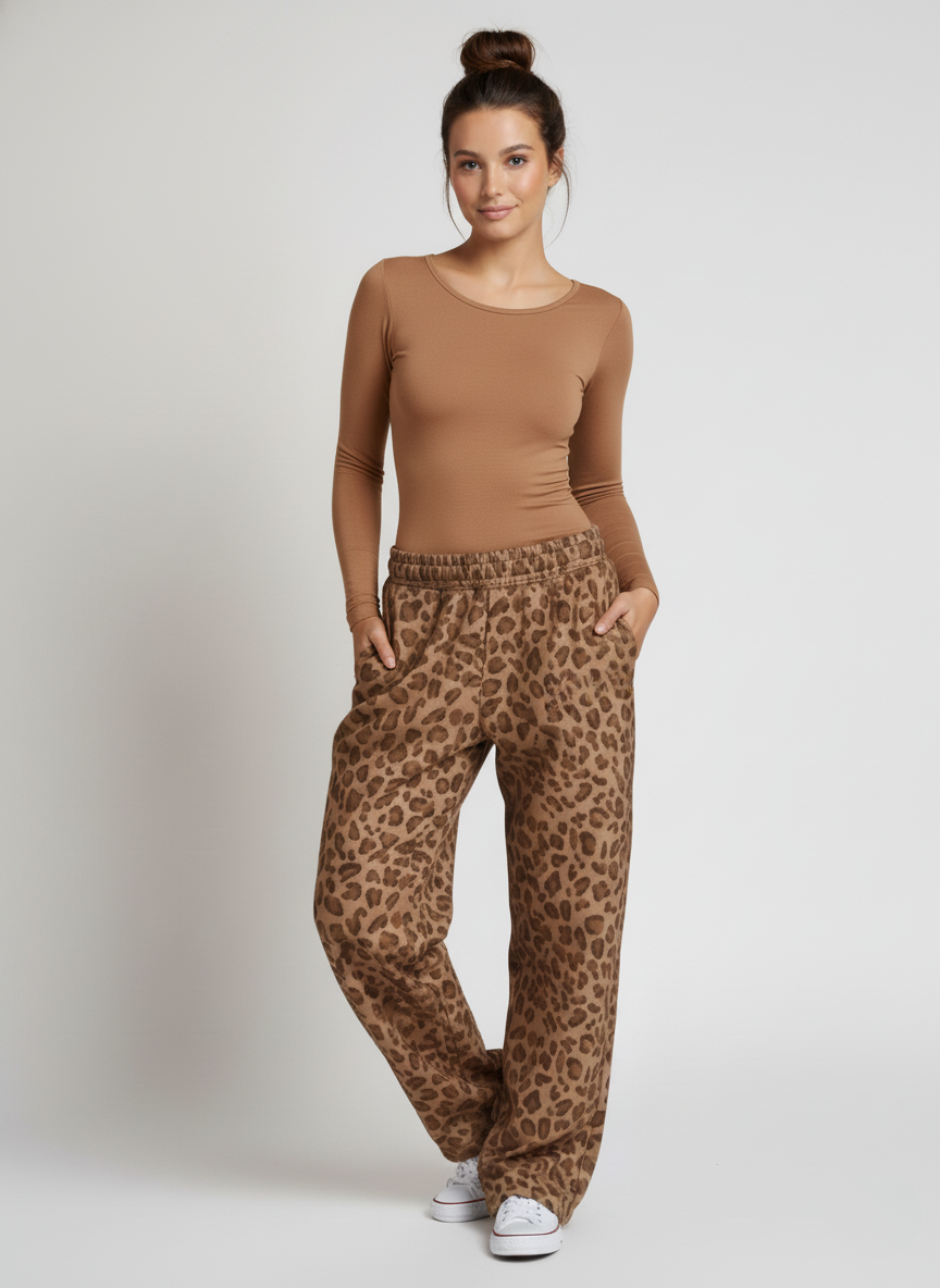 De oversized lommene gir både praktisk bruk og en chic detalj, slik at du kan bære det viktigste uten å gå på kompromiss med utseendet. Det brune leopardmønsteret tilfører en leken, trendy touch, som gjør disse sweatpantsene til et statement-plagg i garderoben.