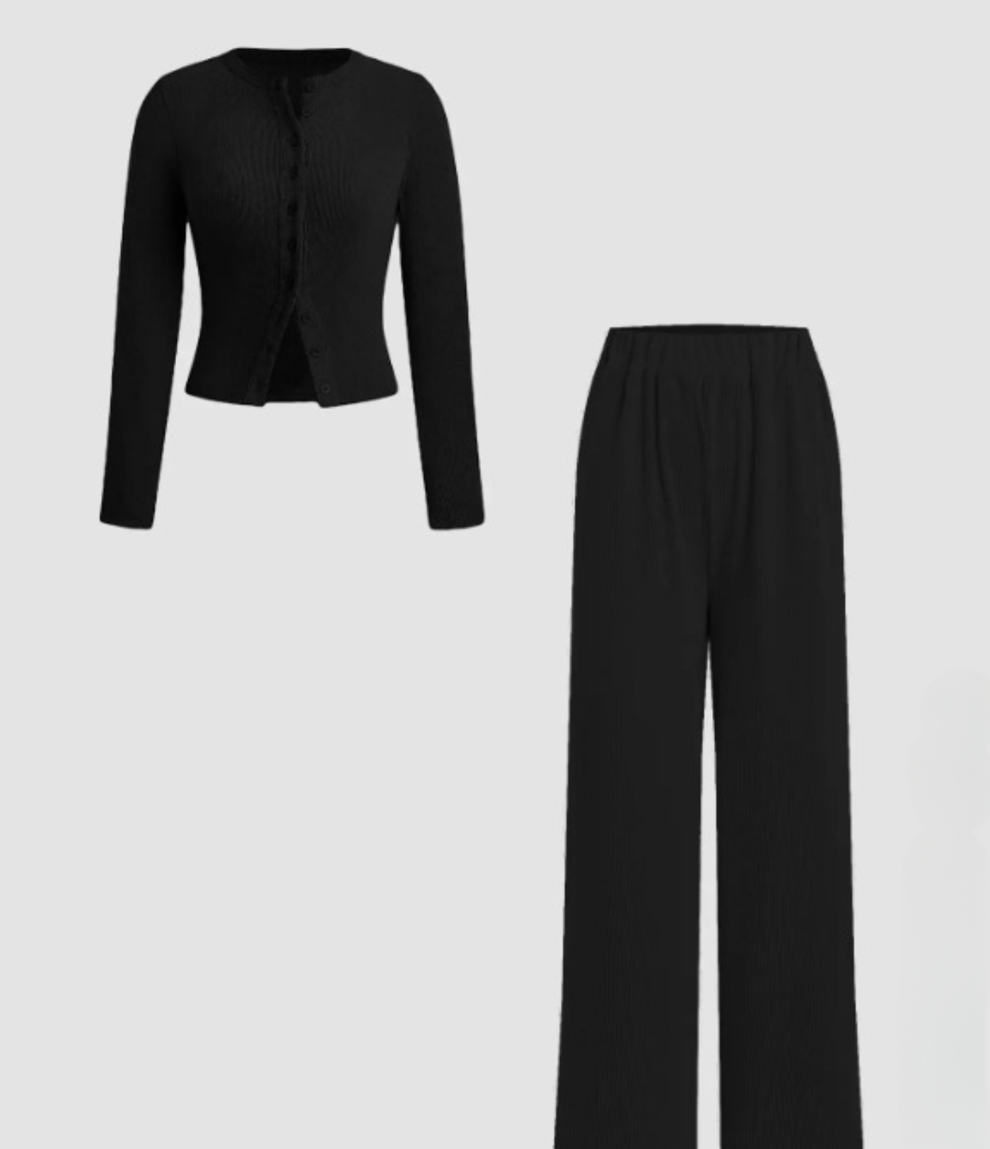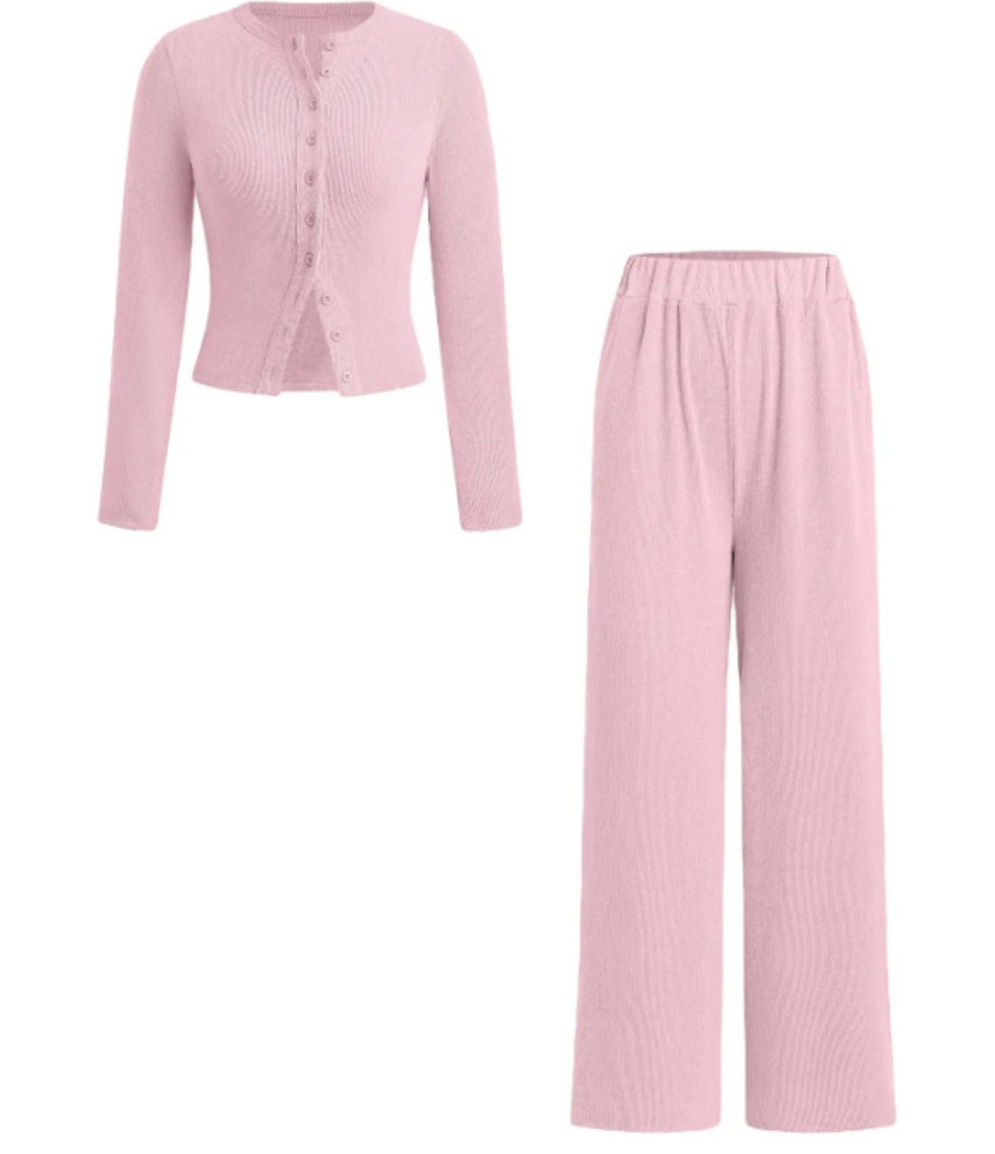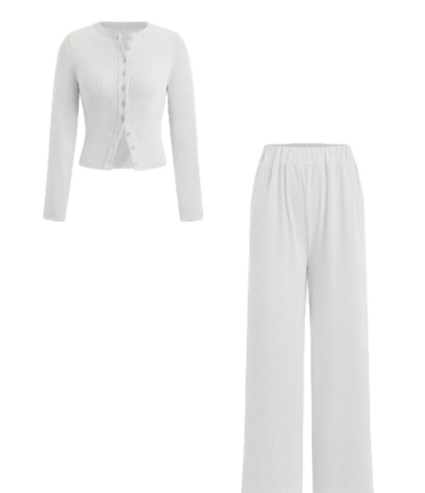 - To-delt set: Inneholder en langermet topp med rund hals og rette, avslappede bukser – et koordinert antrekk for enhver anledning.