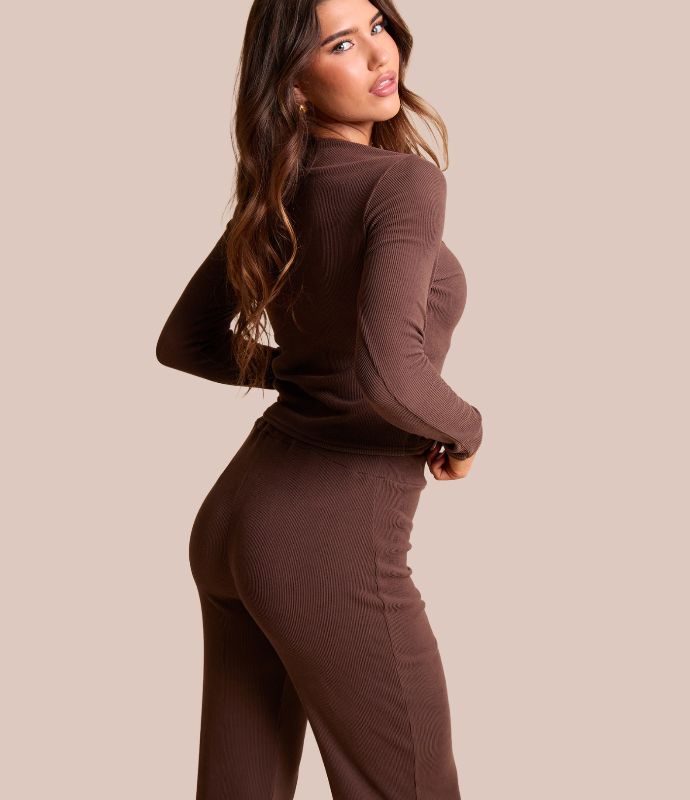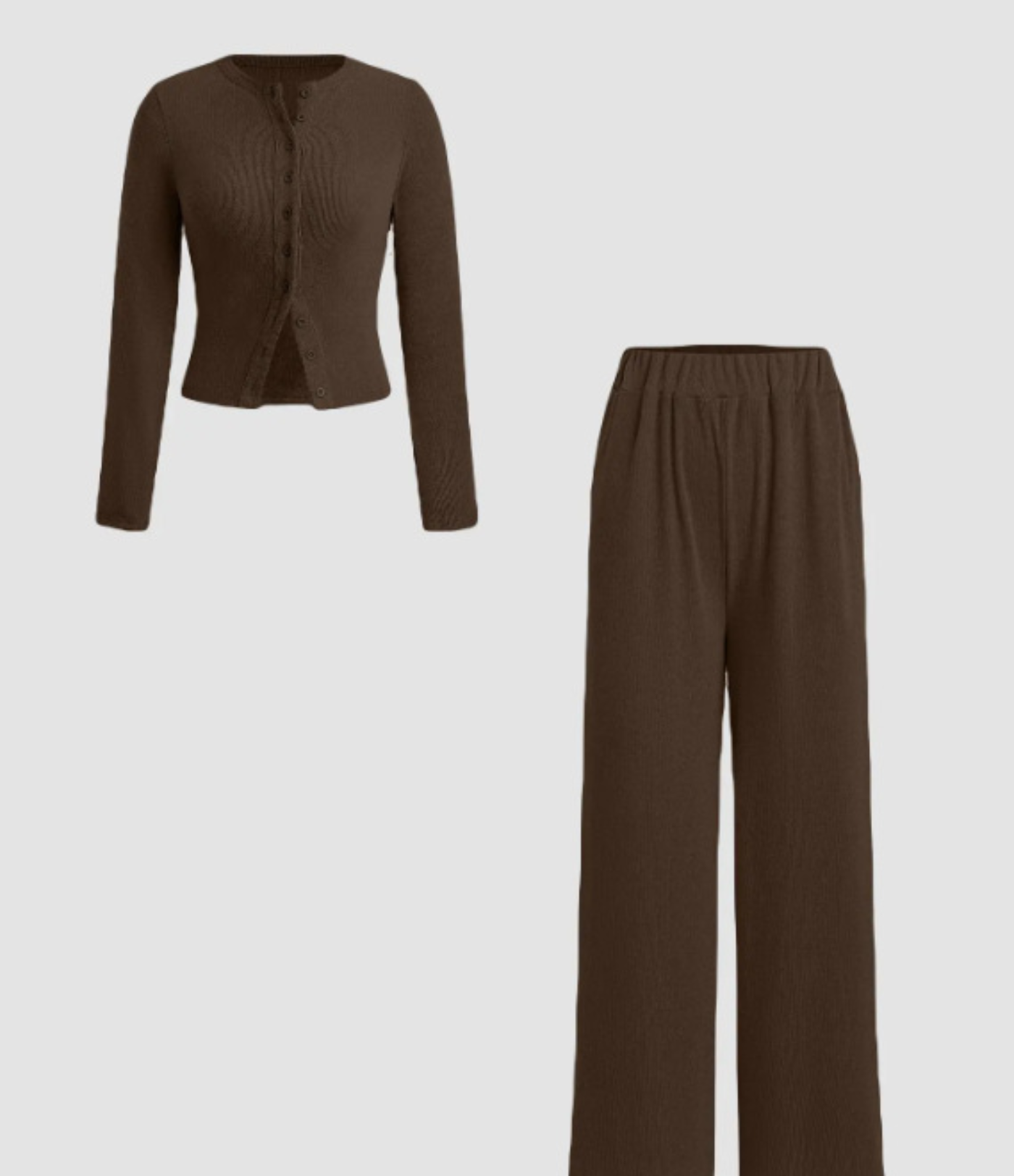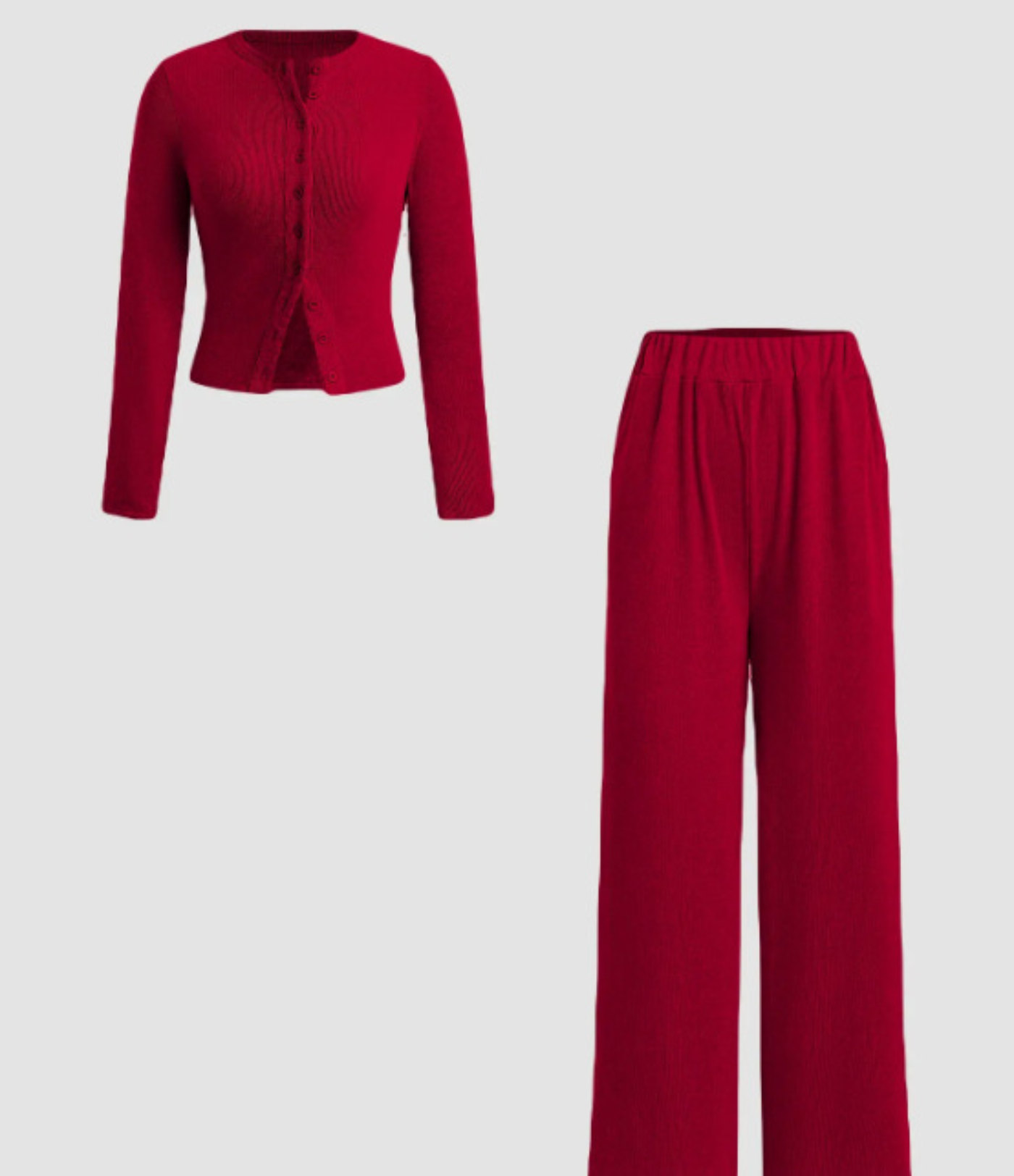 - To-delt set: Inneholder en langermet topp med rund hals og rette, avslappede bukser – et koordinert antrekk for enhver anledning.