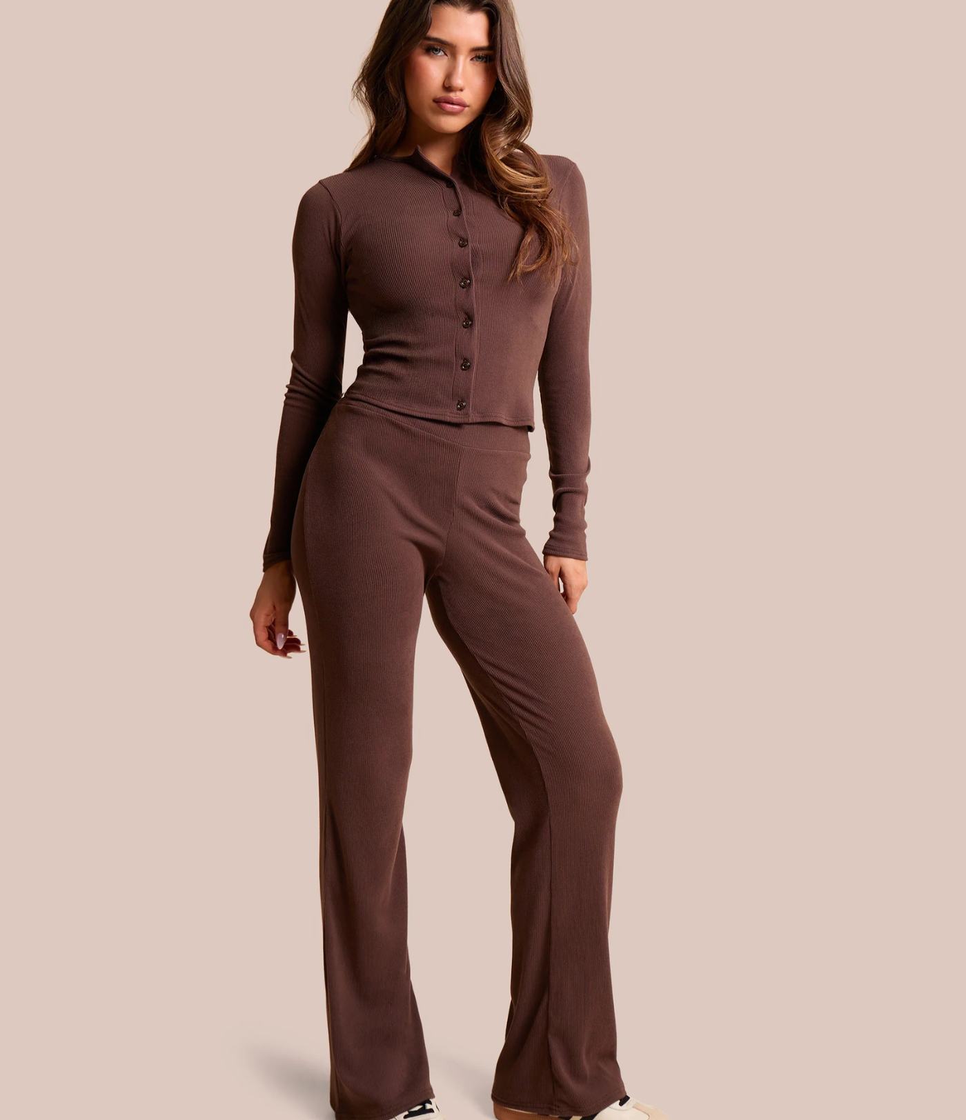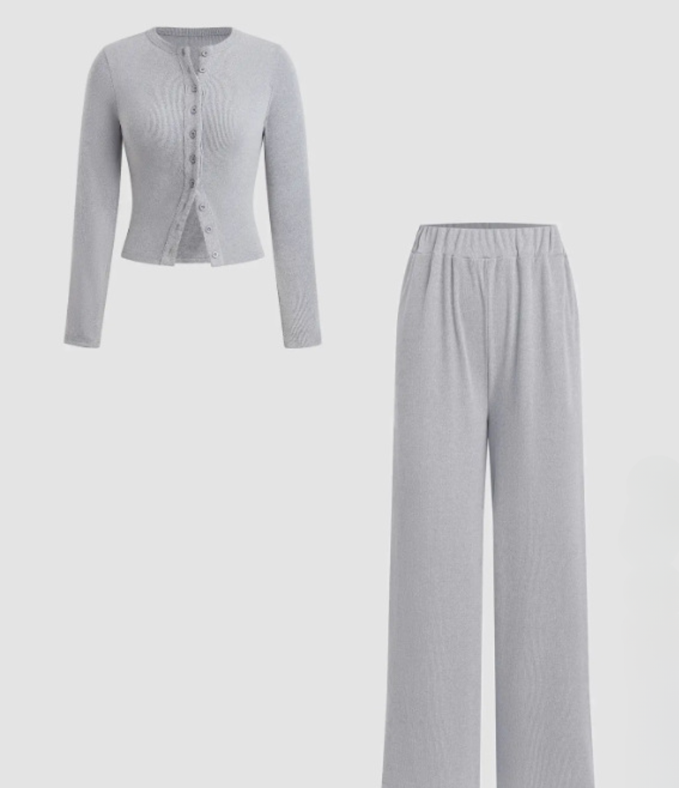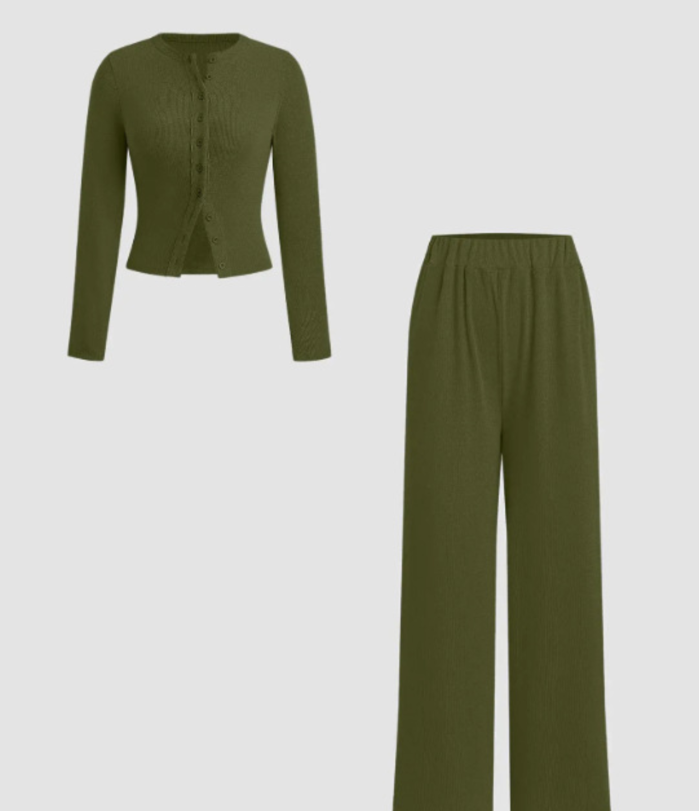 Settet består av to deler – en crop topp med knapper og lange bukser med elastisk midje. Begge deler matcher perfekt i design og farge for et helhetlig, avslappet uttrykk.