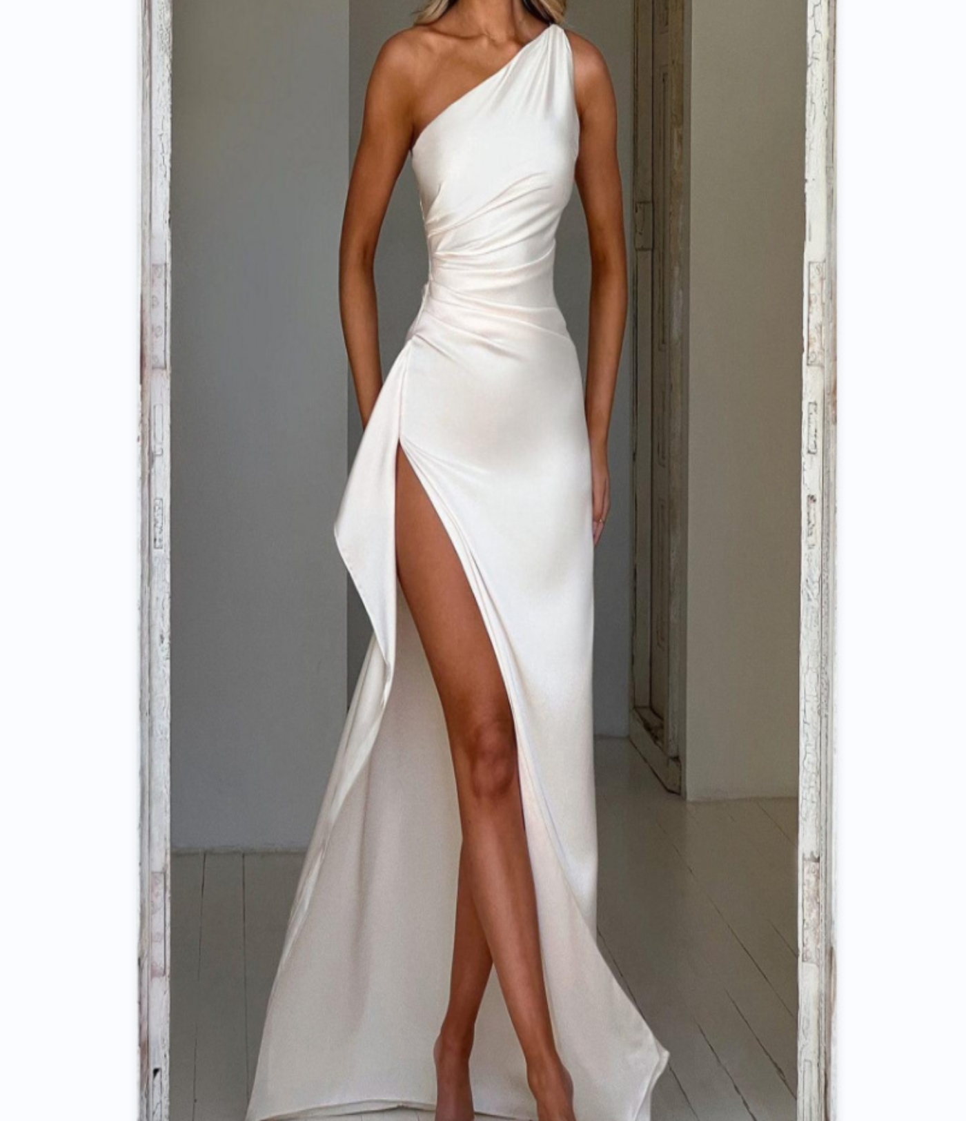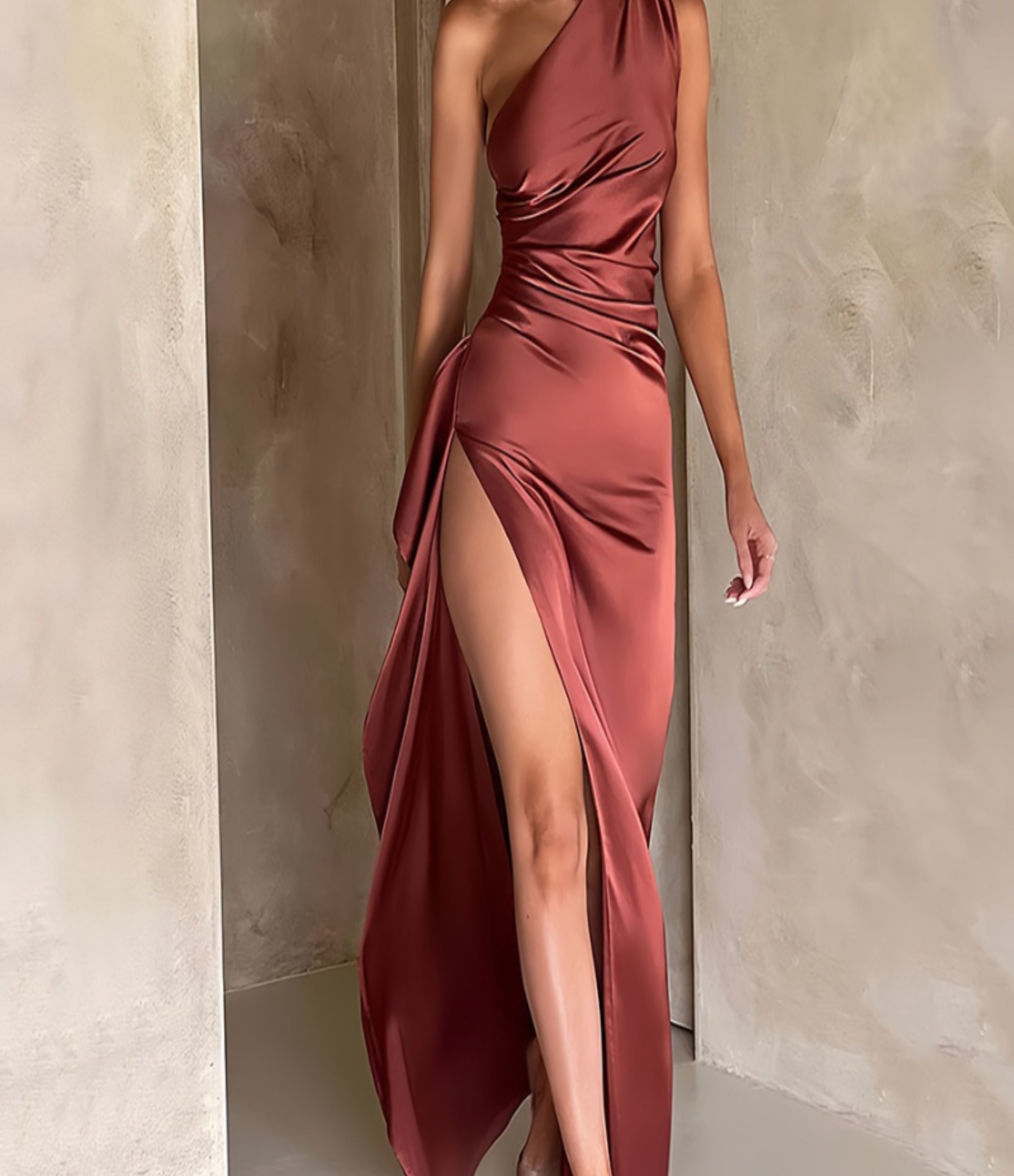 Denne kjolen har et elegant énskuldersdesign og justerbare stropper for perfekt passform. Rynkedetaljer langs sidene og splitt i siden gir et sofistikert preg, som sørger for at du ser fantastisk ut fra alle vinkler.
