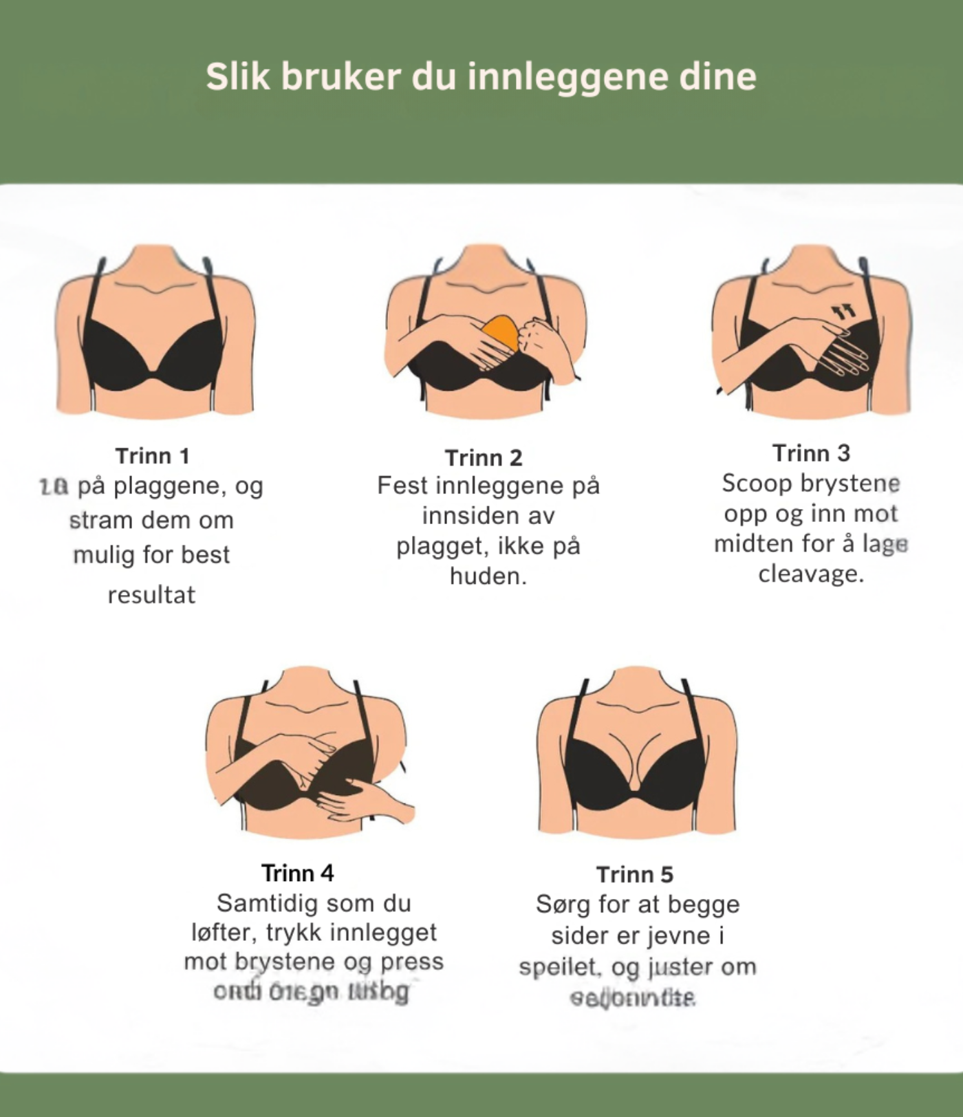 Sett innlegget inn i bh-koppene for en komfortabel og sikker passform. Juster plasseringen for å oppnå ønsket løft og støtte.